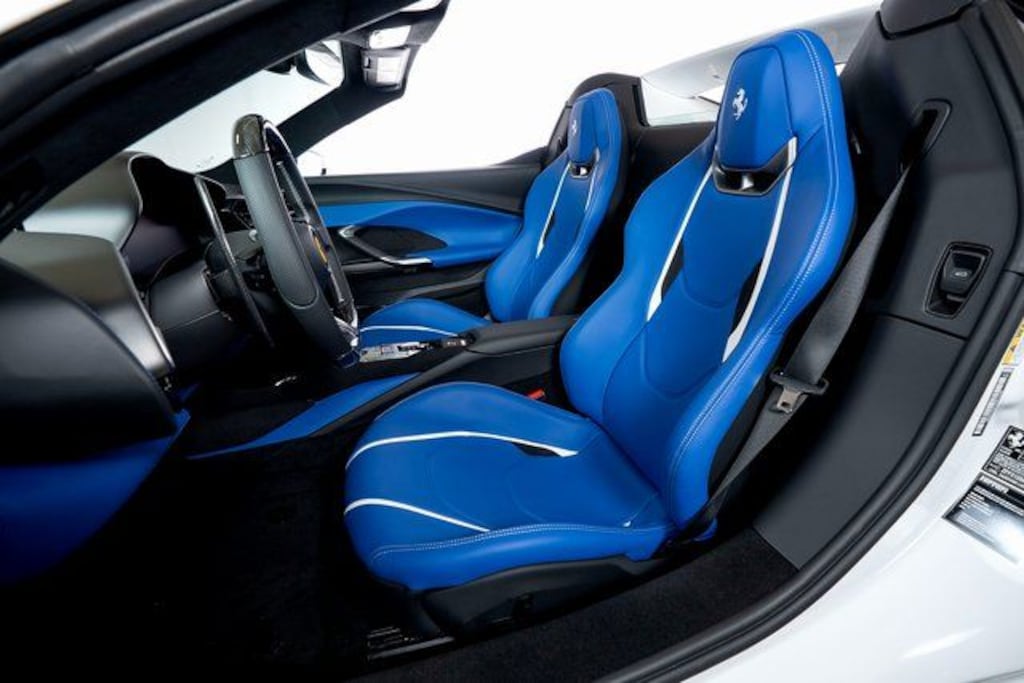 Exterior enhancements include 20-inch wheels with a chrome finish and tailpipe tips in black finish, creating a refined yet aggressive stance. Inside, the cabin is elevated by a carbon fiber steering wheel with LEDs and an embroidered Cavallino on the headrests in Bianco, reinforcing the cars bespoke craftsmanship and attention to detail.