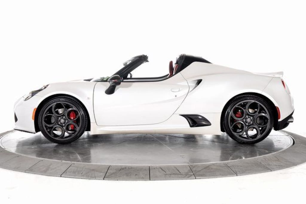Built around a carbon fiber monocoque chassis, the 4C Spider delivers razor-sharp handling and an incredibly engaging driving experience. This example is equipped with the Race Tuned Suspension, enhancing its already dynamic character with sharper response and heightened road feel. The aggressive stance is complemented by staggered 18" x 7" and 19" x 8.5" Dark 5-Hole wheels wrapped in 205/40R18 and 235/35R19 three-season performance tires, while striking Alfa Romeo Red brake calipers add a bold finishing touch behind the wheels.