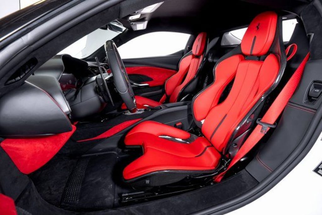 The cockpit is distinctly driver-focused, featuring carbon fiber Corsa racing seats and a carbon fiber steering wheel with integrated LEDs inspired by Ferraris Formula 1 technology. An embroidered Cavallino on the headrests in Nero adds a refined contrast within the Rosso Ferrari interior.